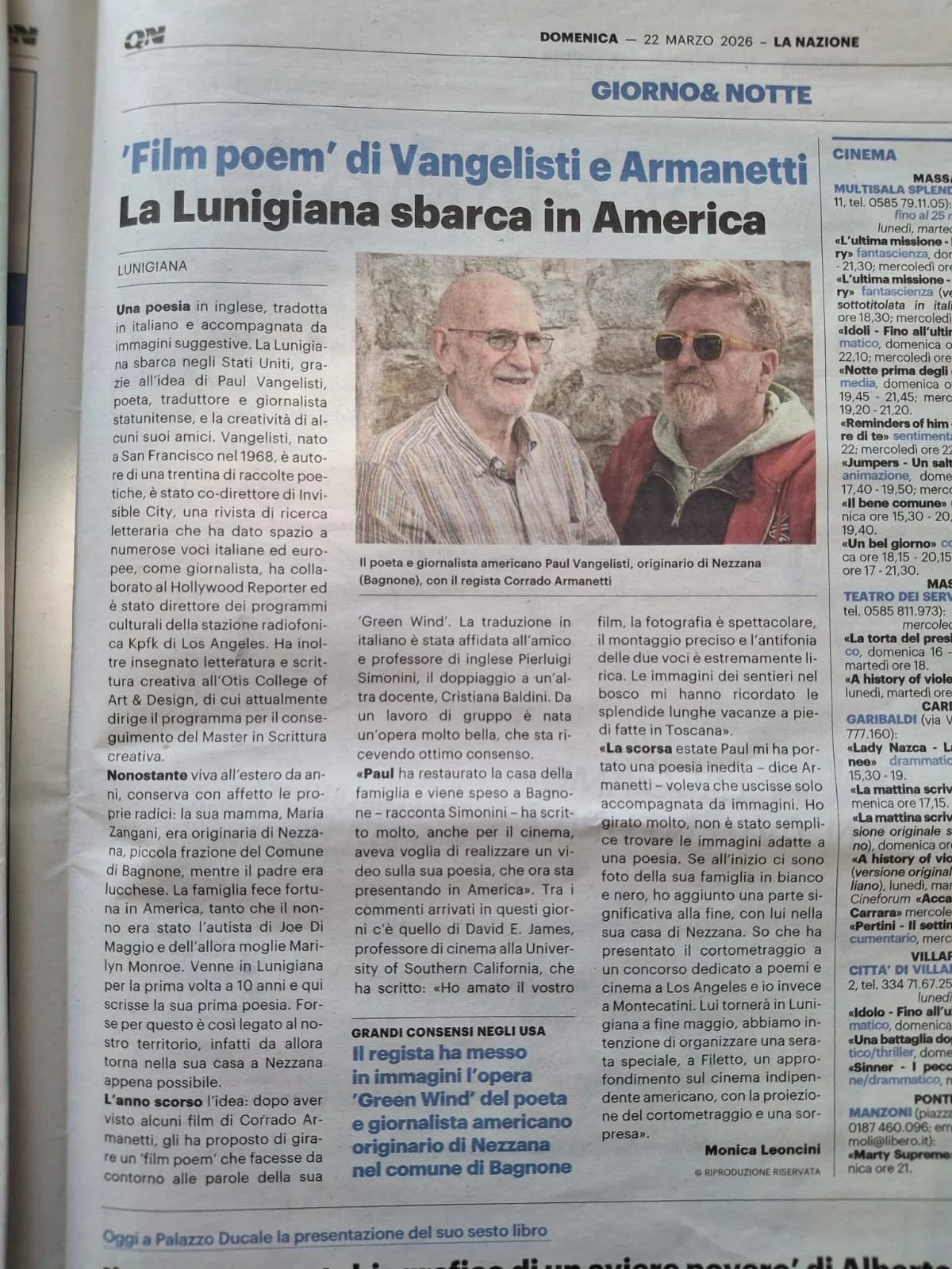 Green Wind mentioned in La Nazione! Green Wind (2025) mentioned in La nazione. Sean PessinMarch 24, 2026Paul Vangelisti, Corrado Armanetti Facebook0 Twitter Tumblr 0 Likes